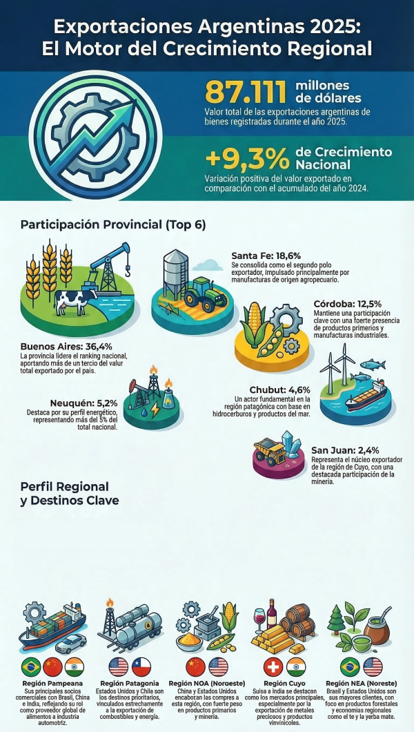 El sector externo argentino ha finalizado el año 2025 con un balance altamente positivo. Las exportaciones de bienes alcanzaron los 87.111 millones de dólares, lo que supone un crecimiento del 9,3% en comparación con el periodo anterior. Este salto cualitativo en el comercio exterior se caracteriza por una expansión transversal: por primera vez en años, las cinco regiones económicas del país registraron variaciones positivas simultáneas.